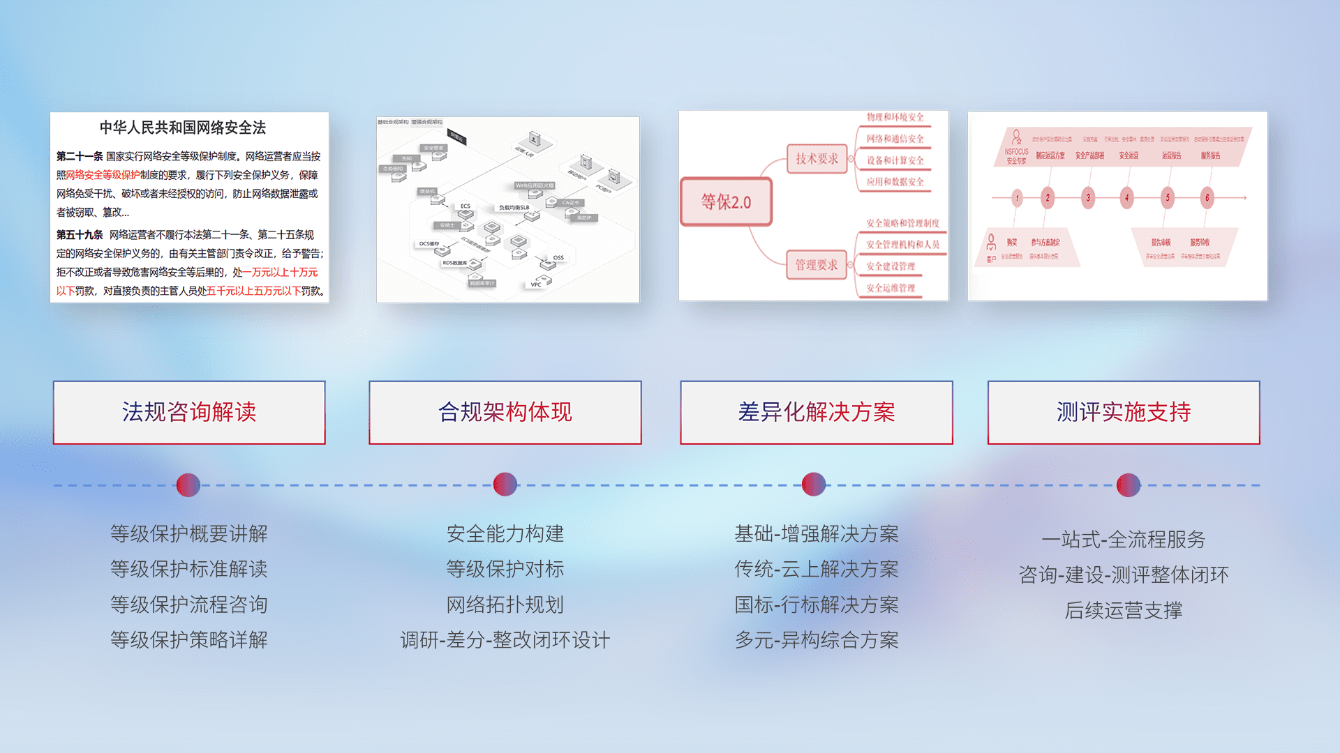通过专业的法律咨询解读、、、合规架构体现、、、差异化解决方案、、、测试实施支持等服务,,,为客户量身打造等保合规体系。。。。